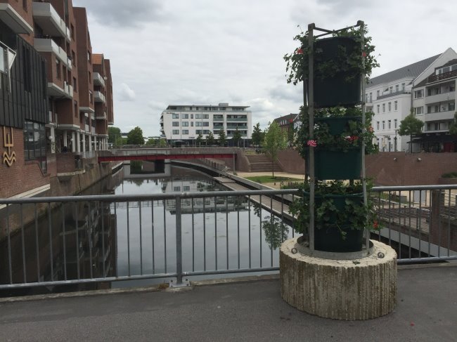 Ob einem das gefällt oder nicht, aber jetzt stehen große Blumenkübel auf der Brücke am Spoyufer/Opschlag und auch eingangs der oberen Gasthausstraße. Die sind vermutlich mit schwerem Gerät dort aufgebaut worden, denn die bereits ziemlich verwittert aussehenden Betonkübel haben Transport-Haken eingelassen und machen den Eindruck, als ob sie schon woanders im Weg standen. 😉