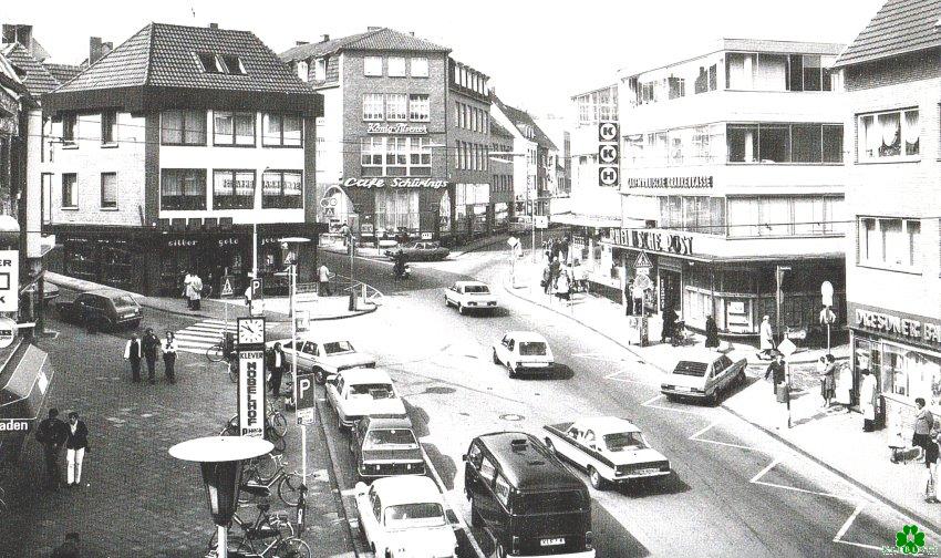 Wer kennt denn noch die Lage rund um den Fischmarkt mit den Geschäften von Cafe‘ Schürings, KKH, Rheinische Post, Schätzlein, Dresdner Bank, Knops, etc. und die markante Werbeuhr? Wer hat denn dort noch geparkt?