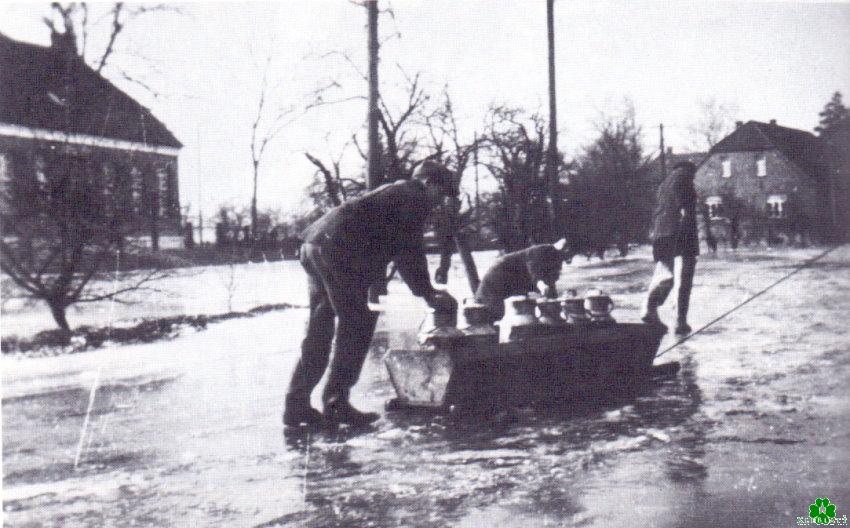 Huisberden wurde in der Vergangenheit schon vielfach aufgrund der Nähe zum Rhein vom Hochwasser heimgesucht. Das gehört fast zur natürlichen Chronik des Ortes. Hier hatte der Frost mal wieder zugeschlagen und das Hochwasser in riesige Eisflächen verwandelt. Aber auch diese unwirtliche Situation wurde von den gebeutelten Bewohnern ausgenutzt und man fuhr Milchkannen im Schlitten über das Eis. So kam die Milch schön gekühlt zum Verbraucher.