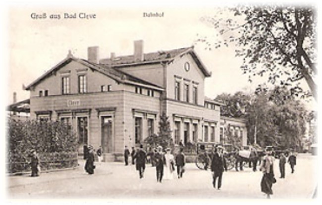 So sah der Bahnhof in Kleve einmal aus, als die Schwanenstadt noch Bad Cleve hieß. Man sieht noch Pferdekutschen und reges Treiben vor dem traditionellen Gebäude.