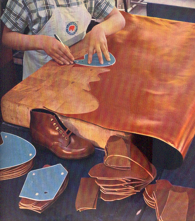 Ein junges Schüsterken hier bei der Arbeit, um sich die Grundkenntnisse des Zuschneidens zu erwerben. Im Zuge der Ausbildung wurde statt mit dem üblichen Stanzeisen zum besseren Verständnis der Lehrlinge zunächst noch mit Messer und Schablonen das Handschneiden des Leders geübt. Hier galt es vor allem, den Verschnitt so gering wie möglich zu halten.