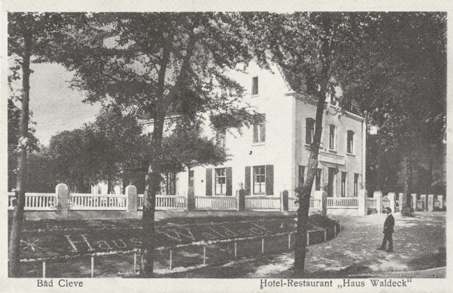 So wie wir es aktuell vom Ortseingang Kleve auf der Nassauer Allee kennen, hatte sich in den 20er Jahren der Gärtner des Hauses Waldeck nicht nehmen lassen, den Schriftzug als einladenden Blütenschmuck vor dem Hotel-Restaurant zu gestalten. Es gehörte zu den beliebtesten Anlaufstellen zu seiner Zeit, da es über einen schattigen Biergarten verfügte und von seiner Lage am Tiergartenwald profitierte.