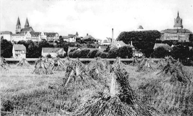 Solche schönen Heuhöpper sieht man heute nicht mehr, denn sie waren noch von Hand aufgesteckt worden. Im Hintergrund sehen wir noch das alte Kleve, wie es sich damals präsentierte. Links unterhalb der Türme der Stiftskirche thronte der majestätische Prinzenhof. Rechts davon die Synagoge, die jüdische Schule und das „Haus auf Stelzen“, das Terrassen-Restaurant „Zur Schwanenburg“. Der große Schornstein gehörte zum Stadtbad.