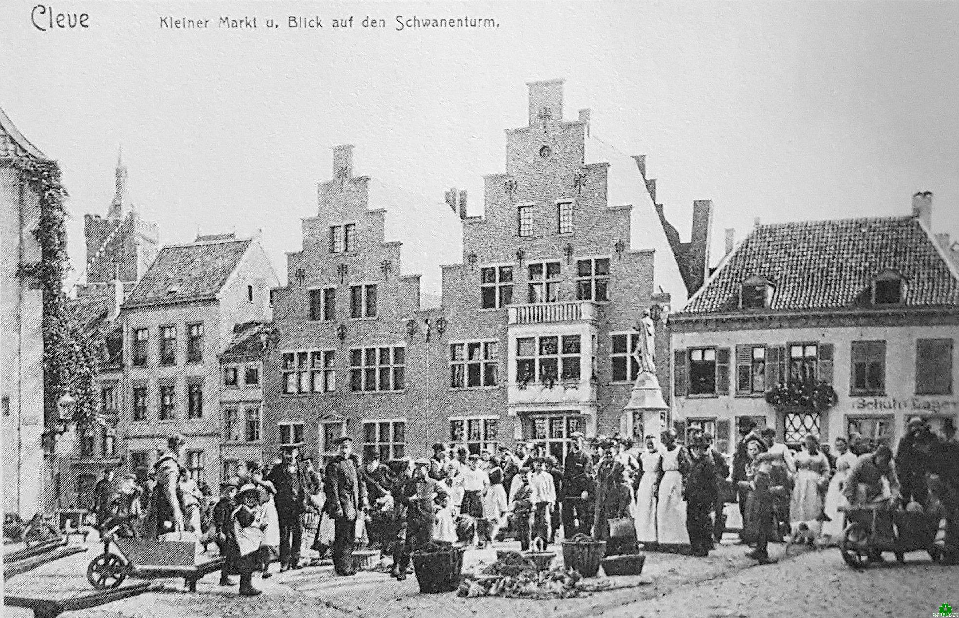 Diese alte Ansichtkarte ist bezeichnet mit: „Kleiner Markt u. Blick auf die Schwanenburg“. Nun – dieser Blick ist nicht so eindeutig, wie man meinen mag. Man sieht das Klever Wahrzeichen links ganz schwach mit einer leichten Beflaggung. Rechts am Rand des Bildes erblickt man noch ein Schuhlager. Das Lohengrin-Denkmal rechts/Mitte verschwindet fast im Gewusel der Menschen, die sich hier am Markttag aufhalten und den Fotografen bewundern.