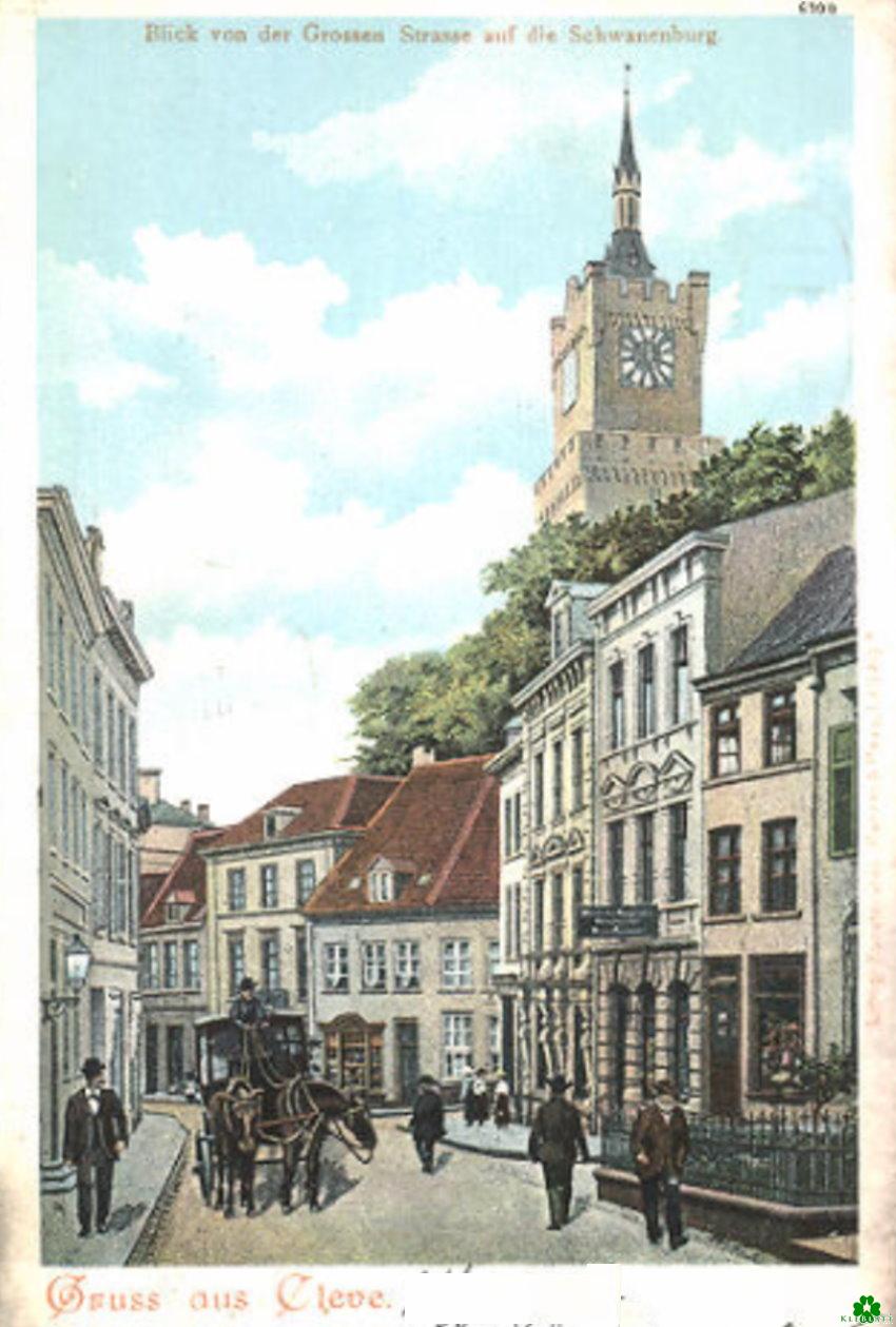 Hier irrt der Kartenhersteller Es ist offensichtlich der Blick von der Hagschen Straße in die Grosse Strasse und auf die Schwanenburg. Trotzdem ein sehr schönes zeitgeschichtliches Bild vom alten Cleve.