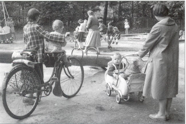 Der nostalgische Kinderwagen lässt erahnen, das wir uns hier Ende der Fünfziger Jahre befinden, wo auch noch eine einfache Wippe aus einem Baumstamm mit zwei Bügeln bestückt die Bewegung förderte. Im Hintergrund der damals unvermeidliche Sandkasten.