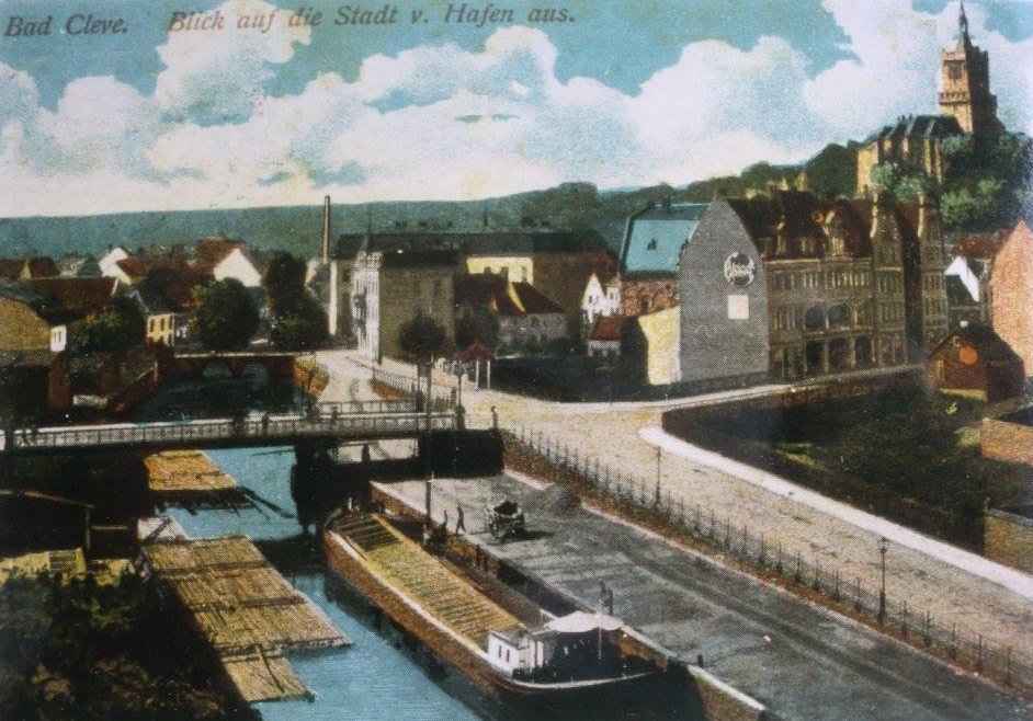 Die Baumstämme kamen vermutlich aus dem Schwarzwald und wurden bis nach Holland geflößt. Auch ein Sägewerk in Xanten wurde beliefert und möglicherweise auch Dorsemagen in Kleve. Auf diesem Bild sieht man sehr schön, wie es damals am Klever Hafen so zuging. Die Farben waren allerdings nicht echt und wurden ins Foto hinein koloriert. Die Brücke ist die heutige Herzogbrücke.