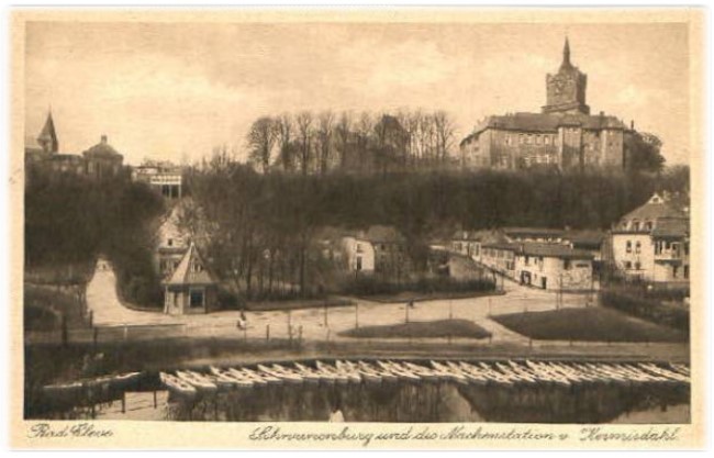 Dort erkennt man nämlich das sogenannte „Haus auf Stelzen“, das Restaurant „Schwanenburg“, welches mit einer fantastischen Terrasse ausgestattet war, von der aus man einen unglaublichen Weitblick sogar bis Elten hatte. Daneben sehen wir die jüdische Schule und die Synagoge.