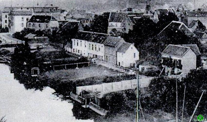 Wenn man die Schwanenburg nicht sieht, kommen einem Zweifel. Hier handelt es sich um ein mehr als 100 Jahre altes Foto. Es zeigt eine Reihe von Häusern, deren Gärten direkt am Wasser liegen. Oben links erkennt man ein großes Gebäude, welches eventuell Aufschluss gibt, wo genau wir uns hier befinden.