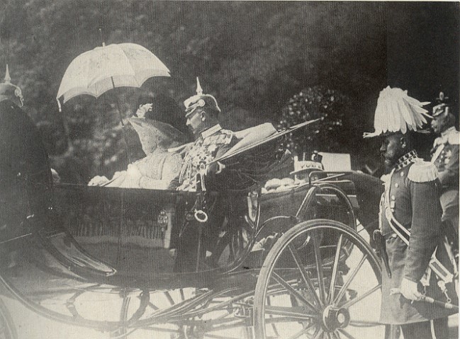 Am 09. August 1909 – also exakt auf den Tag genau vor 105 Jahren – besuchte Kaiser Wilhelm II. die Stadt Kleve anlässlich der Feier zur 300-jährigen Zugehörigkeit des Herzogtums Kleve zu Brandenburg-Preußen. Hier sieht man ihn mit der typischen Pickelhaube in Begleitung seiner Frau in der edlen Pferdekutsche.