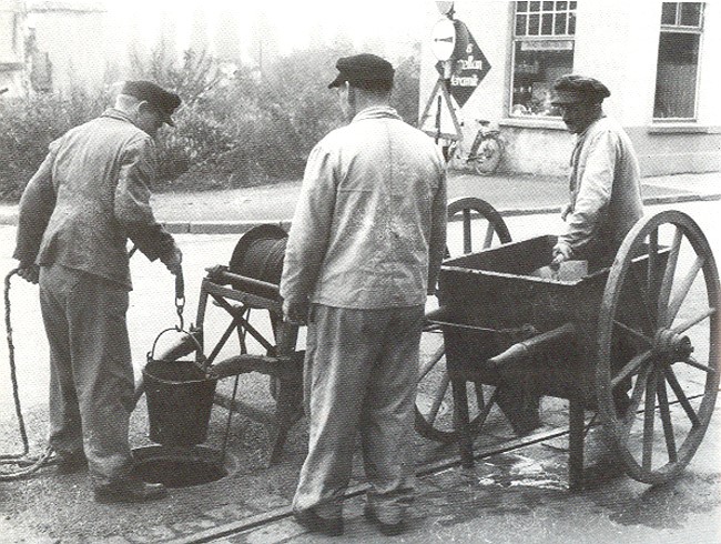 Heutzutage erfolgt die Kanalreinigung in Kleve mittels Hochdruck-Spezialwagen. Damals in den Fünfziger Jahren gab es das alles noch nicht und so mussten die städtischen Arbeiter mit einem Schöpfeimer an der Leine in schwerer Handarbeit diese Aufgabe bewältigen.