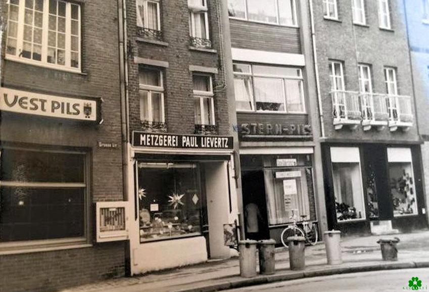 Wir sehen hier die Metzgerei Paul Lievertz und rechts daneben den Imbiss seines Sohnes Wilhelm, den man derzeit auch Pogge Wim nannte. Die blechernen Mülltonnen deuten noch auf die Zeit hin, als dieses Foto entstand. Sicherlich gibt es noch zahlreiche Klever/innen, die Fleisch und Wurst bei Lievertz gekauft haben und im Imbiss von Pogge Wim Pommes, Brat- und Currywurst oder Schaschlick etc. gegessen haben. Warst Du auch dabei?
