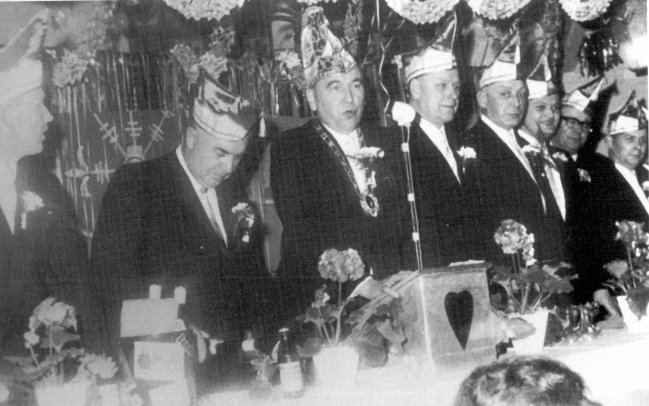 Hier sehen wir den Elferrat mit dem damaligen Sitzungspräsidenten Franz Liffers bei der 1. Prunksitzung der Gesellschaft in der Session 1968/69.
