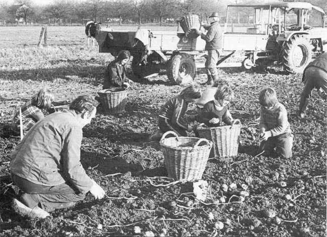 So nannte der Klever das Ernten der Kartoffeln. Damals in den Sechzigern war das noch knüppelharte Handarbeit, wie man auf dem Bild sehr schön sehen kann. Man lag auf den Knien und füllte die geernteten Erdäpfel in die Weidekörbe. Von dort aus wurden sie dann in den Hänger der Zugmaschine geschafft für den Transport.
