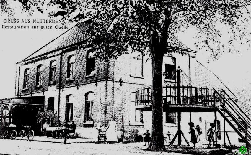 Hier sehen wir eine sehr alte Aufnahme der Restauration Zur Guten Quelle in Nütterden. Auf dem Weg nach Kranenburg ist man gefühlte tausendmal daran vorbei gefahren. Wer war denn schonmal auch drinnen? Interessant ist rechts der elegant gebaute Aussichtsturm. Was vermutete man von dieser etwa 2 Meter hohen Plattform besser zu sehen? Seine Schuhe? 😉