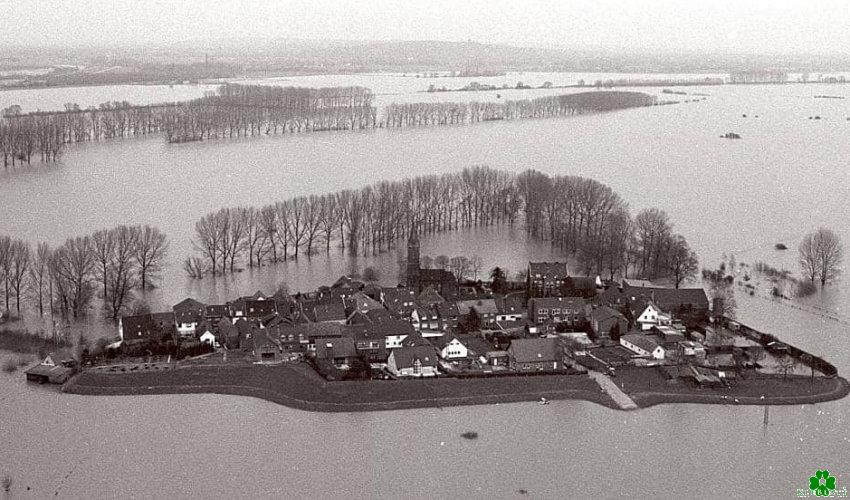 Es schaut ein wenig bedrohlich aus, aber die Einwohner von Schenkenschanz kannten und kennen das Gefühl, vom Wasser umzingelt zu sein. Da gehört eine gute Gemeinschaft dazu, einige Zeit derart abgeschnitten zu sein.