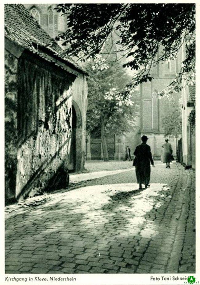 Ein wundervoll bezeichnender Titel für dieses Bild aus längst vergangenen Zeiten. Ältere Damen befinden sich auf dem Weg zur Messe in der Stiftskirche. Das Haus am linken Bildrand sieht bereits ziemlich verkommen aus. Die Wege bestehen noch aus Kopfsteinpflaster. Altes Kleve.