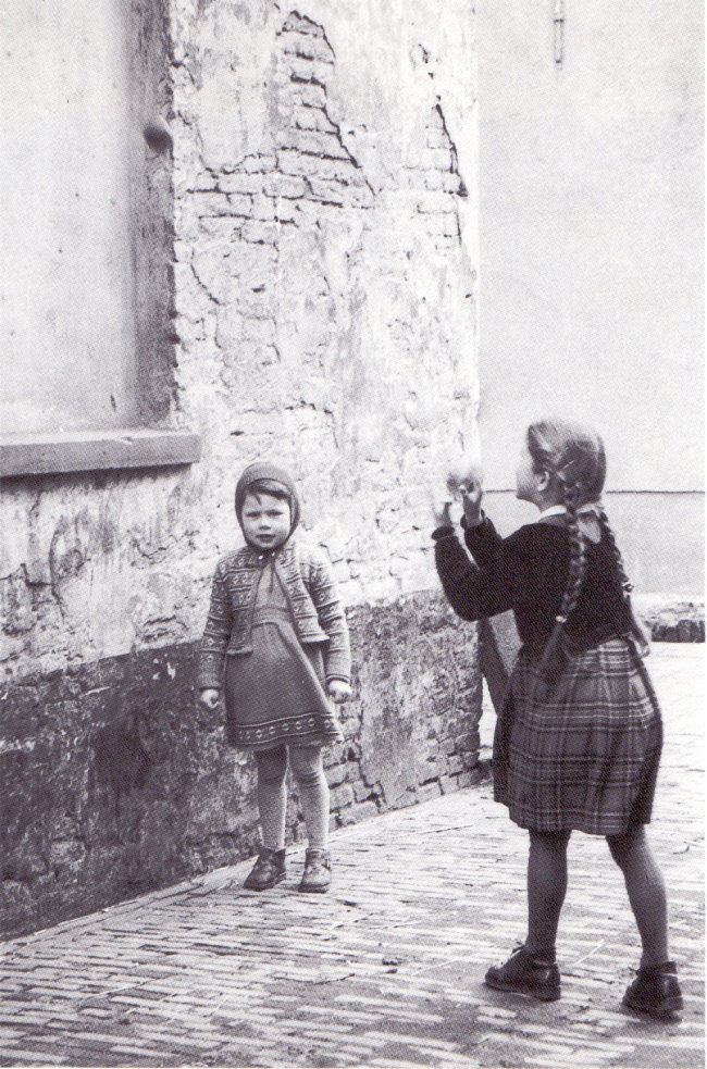 Fast alle Mädchen beherrschten in den Fünfzigern das Klatschballfangen nahezu perfekt. Bei diesem Geschicklichkeitsspiel ging es darum, in die Hände zu klatschen, bevor man einen Ball fing. Dieser konnte – wie hier zu sehen – von einer Wand abprallen, nachdem man ihn dagegen geworfen hatte oder von einer Mitspielerin zugeworfen werden. Die kleine Zuschauerin auf dem Foto scheint daran allerdings wenig interessiert. Sie hatte wohl schon eine Karriere als Model im Sinn. 🙂