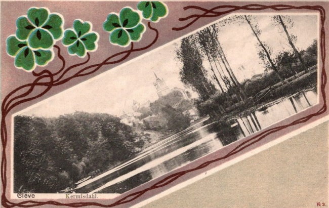 Kleeblätter für Kleve bei KLE-Blatt Bereits um die Jahrhundertwende begleiteten Kleeblätter die Stadt Kleve, wie man auf dieser uralten Ansichtskarte sehen kann. Es war immerhin zu Zeiten, als Kleve noch Cleve war.