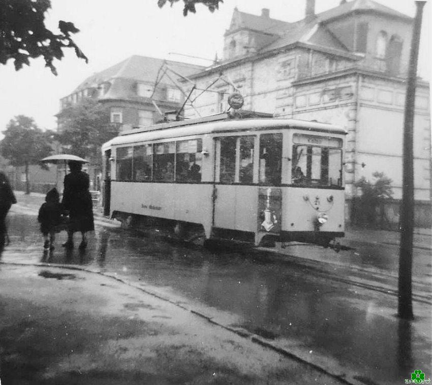 Ob zu Fuß mit dem Schirm oder mit der Straßenbahn, die hier gerade Richtung Bahnhof unterwegs ist, den Regen in Kleve gab es schon immer reichlich. Wir befinden uns hier vor der Villa Wolf eingangs der Herzogstrasse in früheren Zeiten.