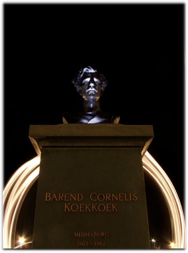 Der große Künstler Barend Cornelis Koekkoek schaut bedächtig bei nächtlicher Illumination auf sein ehemaliges Haus, in dem heute das Museum beheimatet ist.