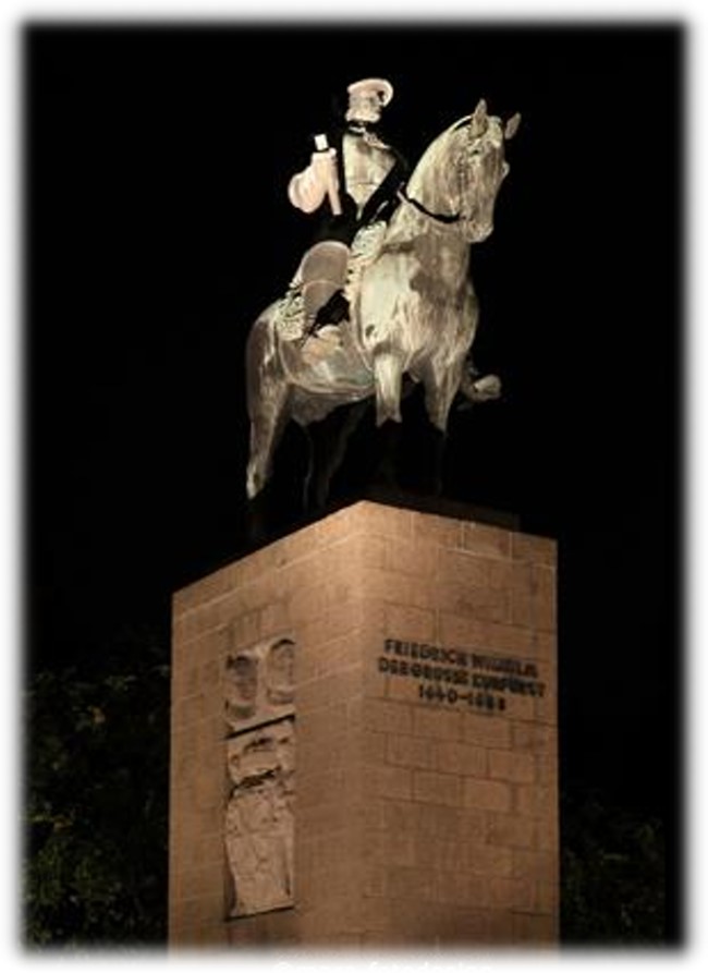 Der große Kurfürst strahlt auch bei Dunkelheit seine Wucht und Faszination aus im Angesicht der Schwanenburg.