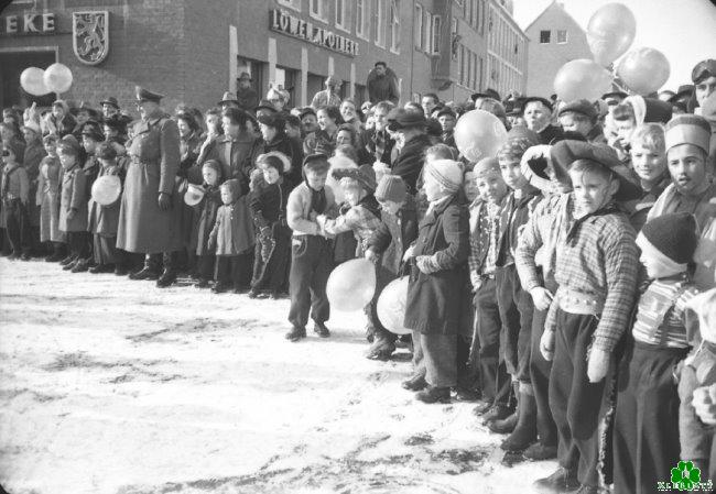 Wir sehen hier Anfang der Fünfziger Jahre die Zuschauer beim Rosenmontagszug. Man sieht an den Verkleidungen der Kinder, wie damals die Vorbilder gesehen wurden und wo die Interessenlage zu suchen war. Alle wollten irgendwie Cowboy sein. Auch ein Kosak hat sich reingeschmuggelt. Die Verkleidungen wurden damals noch von den Müttern in Handarbeit angefertigt und noch lange nicht für jedes Kind.