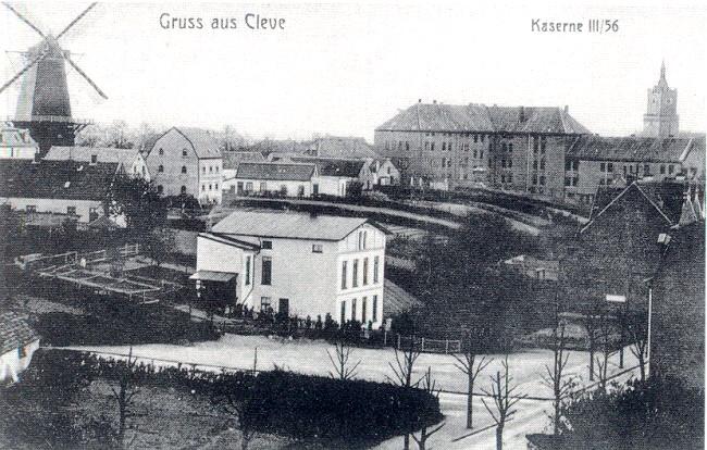 So präsentierte sich in früheren Zeiten die Stadt Kleve, als die Teurlingsche Mühle – auch „Große Mühle“ genannt“ in der Nähe des Heidelberger Tores stand und die alte Kaserne sich am Heideberg befand. Wie immer bei Ansichtskarten aus dieser Epoche wurde auch hier die Schwanenburg noch mit ins Motiv gesetzt, obwohl sie aus diesem Blickwinkel wohl kaum an dieser Stelle zu sehen war.