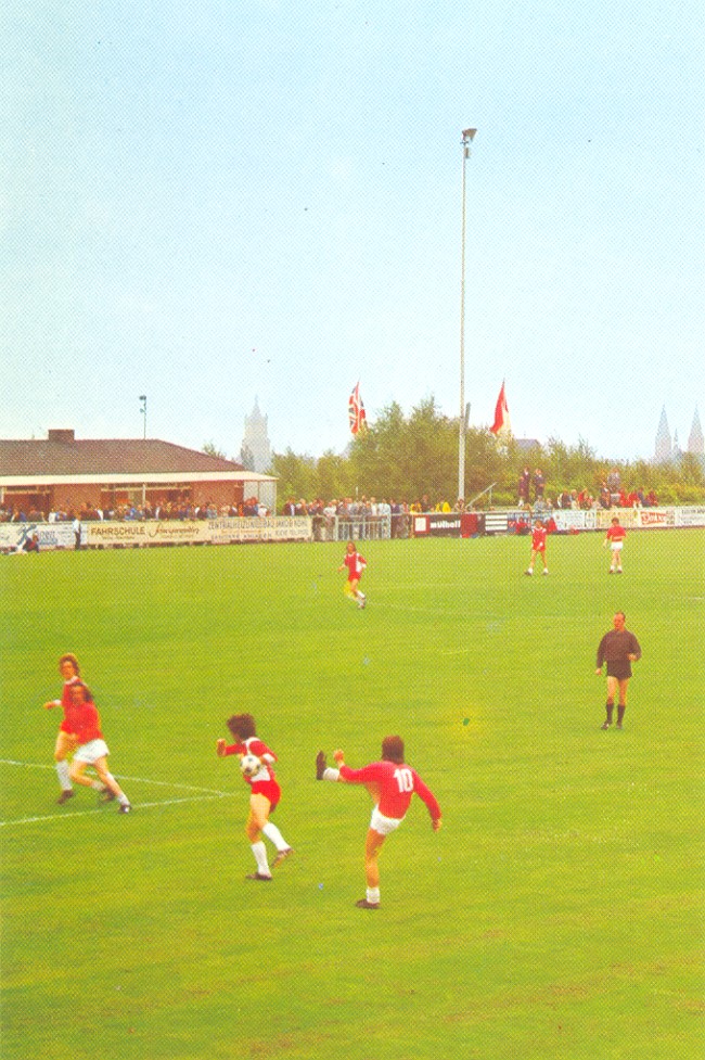 Hier sehen wir auf saftig grünem Rasen das Spiel zweier Knaben-Mannschaften, die zu der Zeit als das Bild entstand wie Mädchen aussahen. Das war halt die Haarmode damals. Der Platz wirkt für die kleinen „Männer“ noch viel zu groß. Im Hintergrund grüßen Schwanenburg und Stiftskirche.