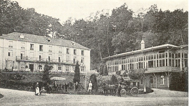 Hier sehen wir das damalige Beförderungsmittel für die Kurgäste, die man vom Bahnhof aus mit Pferdegespannen und Kutschen zum Hotel Robbers brachte, wo sie in unmittelbarer Nähe des Kurbetriebes alle Annehmlichkeiten des derzeitigen Bad Cleve nutzen konnten.