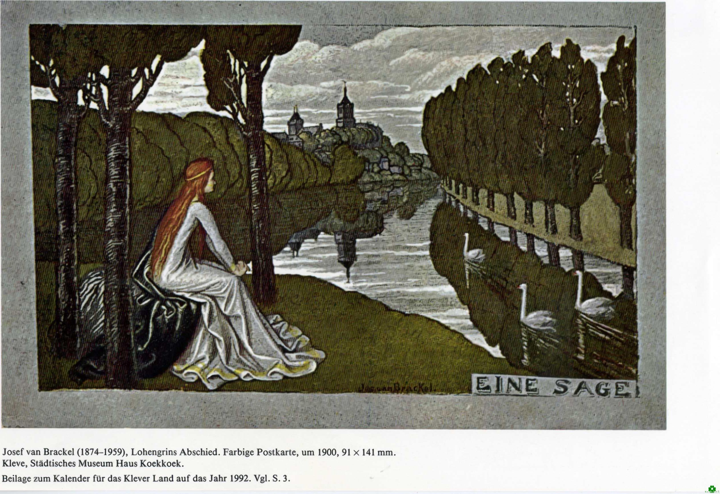 Diese um 1900 von Josef van Brackel erstellte farbige Postkarte trägt den Titel „Lohengrin’s Abschied“.