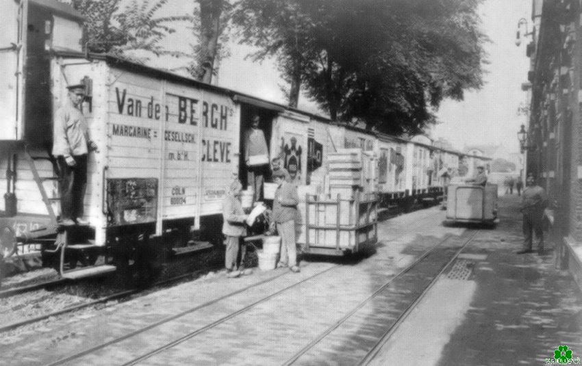 Nun – wenn man Margarine in großen Massen produziert, dann müssen die Pakete auch irgendwie zum Endverbraucher gelangen. Hier sehen wir den hauseigenen Zug, der gerade mit der weißen Fracht beladen wird. Oder steht er tatsächlich schon am Bahnhof von Cleve?