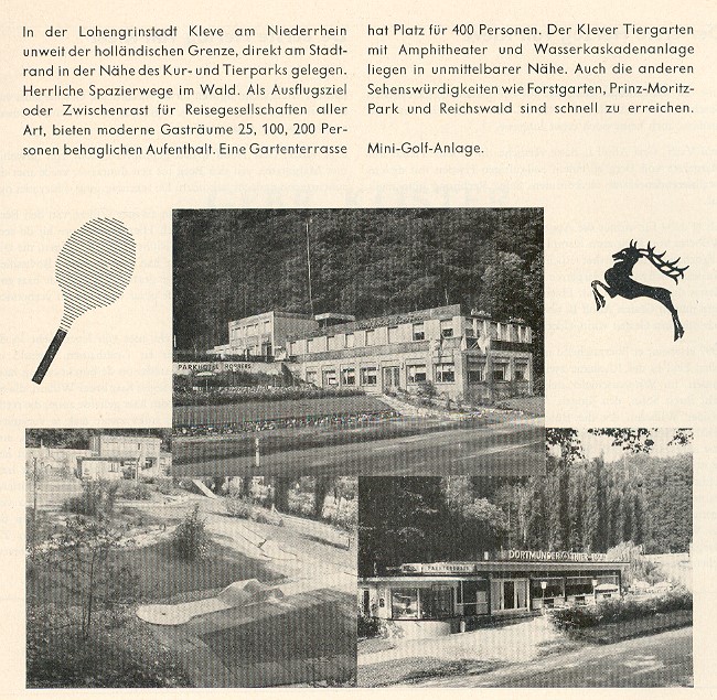 Eine der schönsten Anlagen am Niederrhein – derzeit die einzigste in Kleve – besaß das Parkhotel Robbers. Hier konnte man nicht nur dem Minigolf frönen, sondern auch an sonnigen Tagen das Amphitheater, den Tiergarten und den Forstgarten genießen. Bis auf Minigolf geht das ja gottlob auch heute noch.