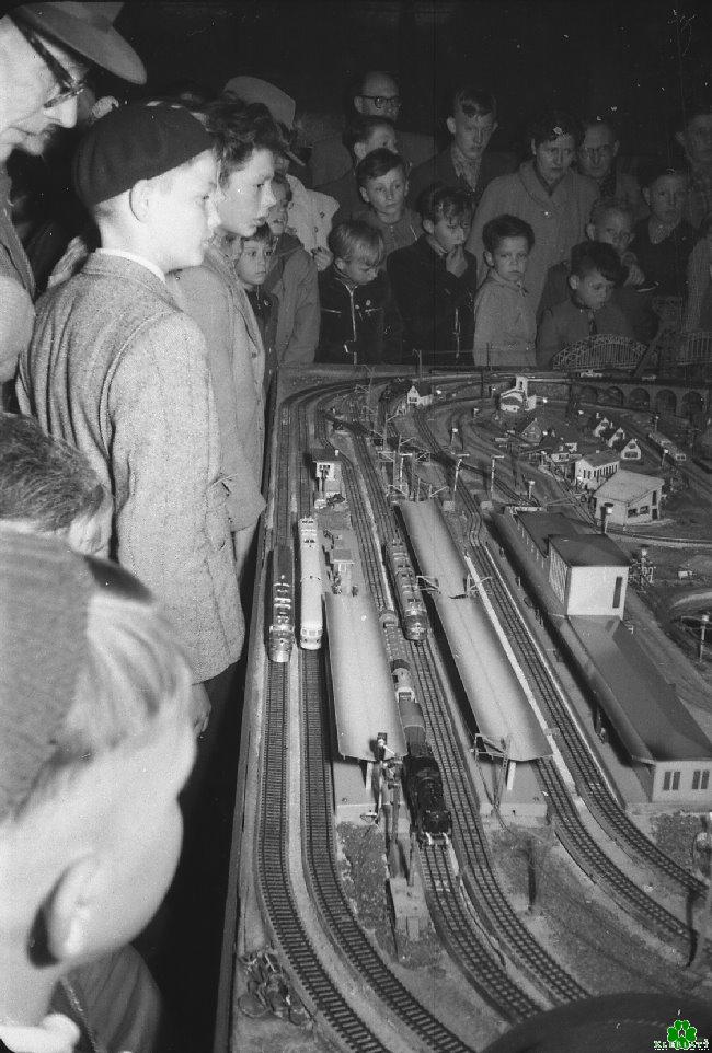 Es war zu Zeiten, als eine Modelleisenbahn zu den größten Weihnachtswünschen der Jungs gehörte. Somit war der Andrang sehr groß, als man eine von den mit viel Akribie und Sachverstand gebauten Bahnen in einer Ausstellung in Kleve bestaunen durfte. Man sieht die bewundernden Blicke, wobei die Erwachsenen ähnlich schauen. Damals gab es eben nicht allzu viel andere Freizeit-Abwechslung. Somit war die elektrische Modelleisenbahn mit ihren originalgetreuen Nachbauten von Lokomotiven, Waggons, Schienen, Weichen, Modellhäusern, Brücken, Schranken, etc. das Nonplusultra des optimalen Spielzeugs. Was man dann aber schnell feststellte war die Tatsache, das die Wägelchen immer nur die Runde drehten, was auf Dauer ziemlich langweilig und ermüdend wurde. Der Hauptspaß lag also darin, die Anlage mit immer mehr – vor allem selbstgebauten – Zubehör zu erweitern.