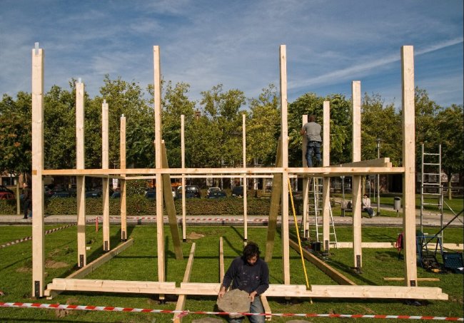 Ein vielversprechendes Gerüst entstand auf der Grünfläche direkt am Rathaus-Bauplatz. Was sollte dort wohl entstehen, fragten sich viele Bürgerinnen und Bürger von Kleve.