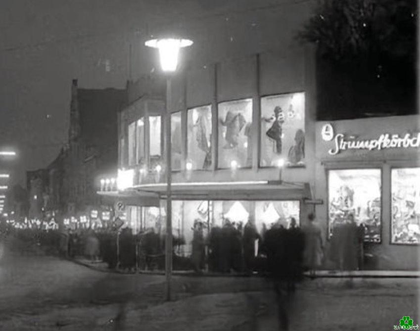 Es sieht aus, wie an einem verkaufsoffenen Sonntag. Die Menschen in der Klever Oberstadt drücken sich vor den Schaufenstern die Nase platt und bestaunen die Auslagen. Auch beim vielen noch bekannten Strumpfkörbchen war das damals keine Ausnahme. Wer hat denn dort noch eingekauft?