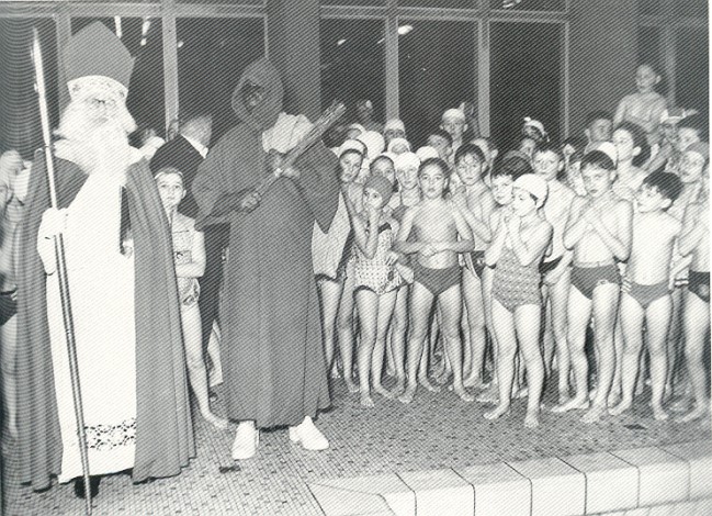 Bei einer Feier des Klever Schwimmvereins im Hallenbad sieht man hier die kleinen Nackedeis im Kontrast zum vermummten Nikolaus mit seinem (das Adjektiv darf man wohl nicht mehr sagen) Pitt bzw. Knecht Ruprecht.