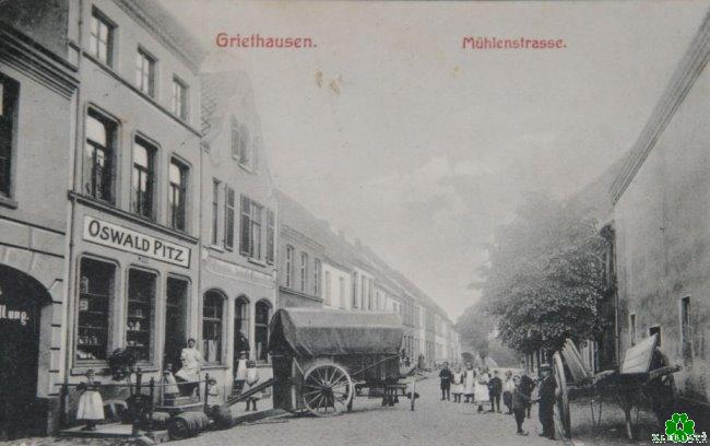Fast sollte man annehmen, man sei im Wilden Westen. Die Menschen stehen hier auf der Mühlenstraße in Griethausen. Die Frauen und Mädchen tragen alle die für die damalige Zeit üblichen Schürzen. Bei Oswald Pitz scheint Anlieferung zu sein. Ein wunderbares Zeugnis vergangener Zeiten.