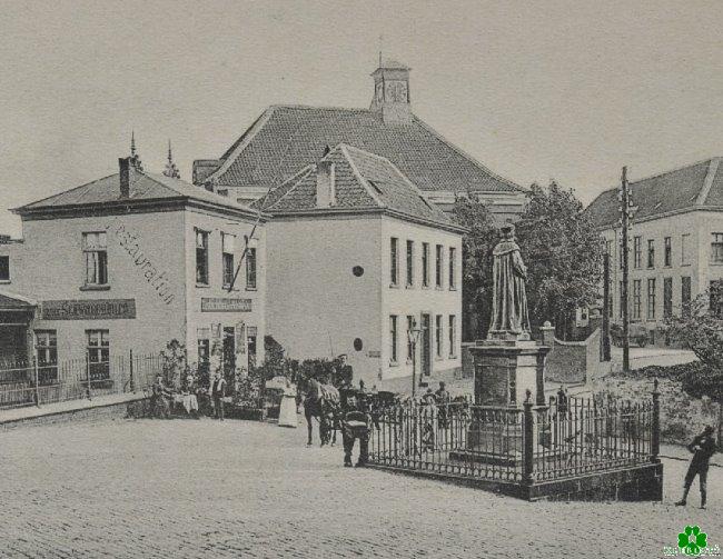 Ein altes Bild von Kleve, was den Ausblick auf die damalige Reitbahn vor der Schwanenburg zeigt. Links sehen wir das „Haus auf Stelzen“, das Restaurant „Schwanenburg“, dahinter mit dem Türmchen die einstige Synagoge und im Vordergrund das Denkmal von Johann-Sigismund. Vor der Restauration sitzen einige Leute entspannt auf einer Bank, ein Pferdegespann wartet auf Fahrgäste und ein Mann links besichtigt das Denkmal etwas genauer. Eine typische Szene im früheren Bad Cleve.