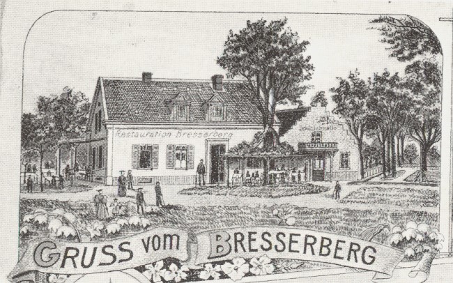 Der Teil einer alten Grusskarte, die bereits im Jahre 1897 verschickt wurde, zeigt die in 1860 eröffnete Gastwirtschaft der Witwe Rudolf Schmidt am Bresserberg.