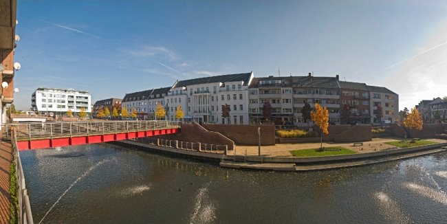 Nein – der Spoykanal fließt nicht um die Ecke. Es handelt sich hier um einen fotografischen Effekt, mit dem der Künstler die neue Seite von Kleve im Gesamten einmal darstellen wollte. Es ist ihm gut gelungen, denn man erfasst mit einem Blick das Rilano Hotel, den Spoy Palais, die Brücke zum Spoycenter und den Anlegeplatz am Kanalufer.