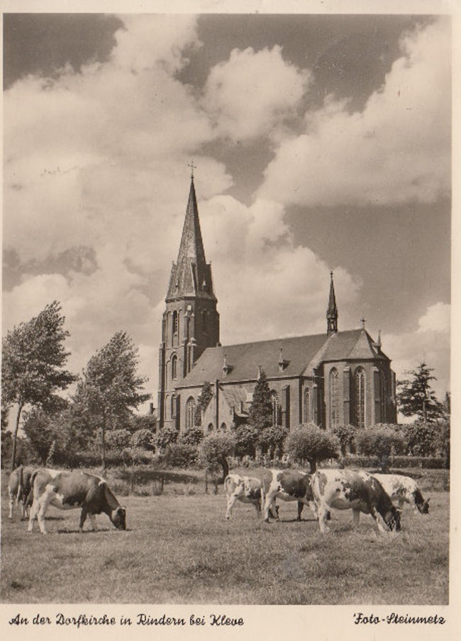 Wie wäre es mit Rindern in Rindern bei Kleve? Treffender kann man diese alte Ansichtskarte nicht beschreiben. Die Kühe grasen gemütlich auf einer Weide vor der Dorfkirche in Rindern. Eine wirklich interessante Aufnahme des Klever Stadtteils.