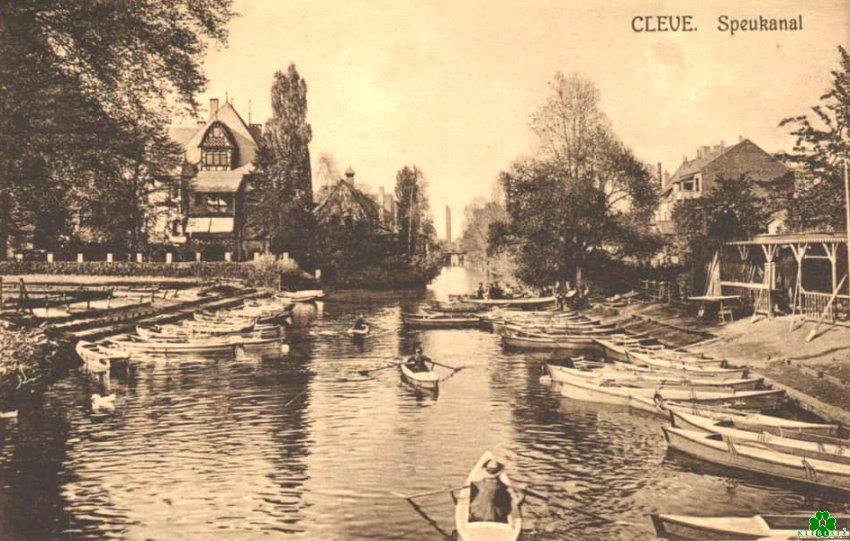 Rudern auf dem Clever Speukanal Tolle Holznachen luden die Menschen im damaligen Cleve zu mancher Bootspartie ein. Beidseitug standen die Kähne von Scho an den Ufern bereit und das Angebot wurde weidlich genutzt.