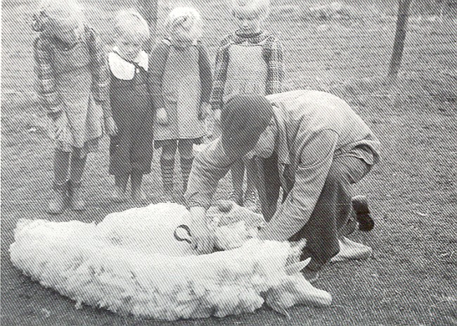 Aktuell geht das natürlich in Windeseile mit automatischem Schurwerkzeug. Damals in den Fünfzigern war es langwieriger durch die Handhabung der manuellen Schere. Aber auch damals waren die Kinder schon begeisterte Zuschauer.