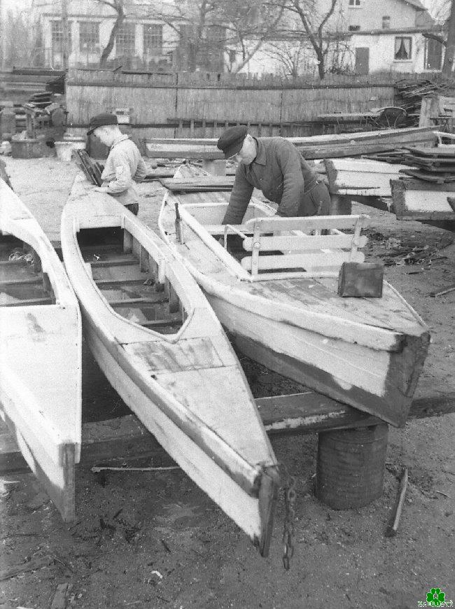 Wir sehen hier einen fleißigen Meister mit seinem Stift bzw. Lehrling bzw. Auszubildenden, der die Ruderboote der Bootsstation Scho für ihre Fahrt auf dem Kermisdahl wieder in Schuss bringt. Es war noch Anfang der Fünfziger und die Holzboote schlugen naturgemäß schon mal leck. Eventuell mussten sie auch neu lackiert werden, denn sie gaben damals ein recht farbiges Bild auf dem Klever Gewässer ab. Außerdem trug jeder Kahn seinen Vornamen seitlich am Bug. Somit konnte man mitunter eine persönliche Beziehung zu seinem „Nachen“ aufnehmen. 🙂