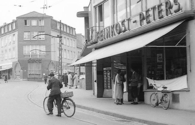 Hier sehen wir zwei Klever Legenden auf einem Bild, nämlich Feinkost-Peters und Cafe‘ Schürings. Das Bild ist in den Fünfzigern oder Anfang Sechzig entstanden, denn die Straßenbahn fuhr noch. Interessant zu wissen wäre, was für einen Automaten man dort bei Peters entdecken kann. Vielleicht weiß es der Ein oder Andere, der sich an diese Zeiten erinnern kann.