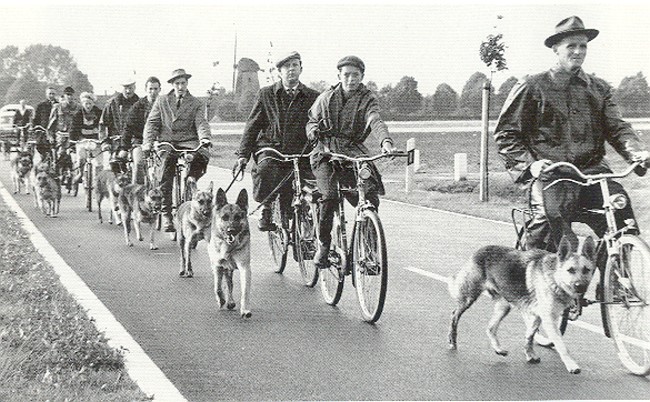 Ein Teil der Schutzhundprüfung der Ortsgruppe Kleve-Kellen – der Ausdauertest – fand im Jahre 1961 auf der Landstraße bei Donsbrüggen statt. Die Hunde mussten immerhin 20 Kilometer neben den Fahrrädern laufen.