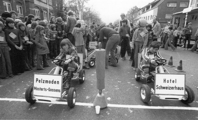 Hier sieht man ein Go-Cart-Rennen von Kindern auf der Hoffmannallee.