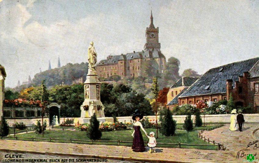 So schön war Kleve mal Fast dreidimensional sieht man hier das Lohengrindenkmal mit Blick auf die Schwanneburg. Die Menschen flanierten unbeschwert über die teils noch unbefestigten Wege und zeigten ihre damals angesagte Mode.