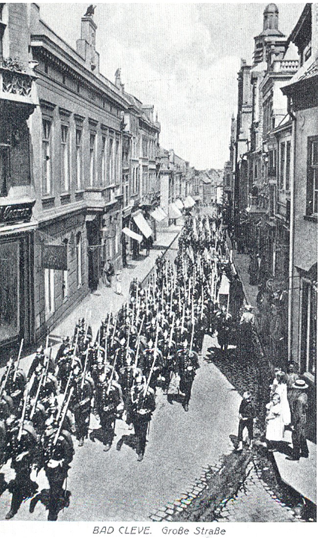 In Höhe des alten Rathauses sehen wir hier Soldaten der damals in Cleve stationierten Regimenter mit ihrer für diese Zeit typischen Ausrüstung mit Pickelhaube und eigener Musikkapelle durch die Stadt marschieren. Im Jahre 1914 ging es dann zurück zum Bahnhof und von da aus in den ersten Weltkrieg.